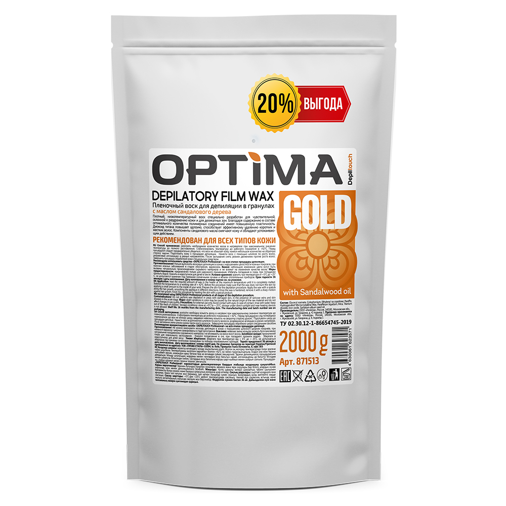 Пленочные воски в гранулах серии OPTIMA - это российские воски нового поколения для депиляции в различных техниках. Пленочные воски наносятся тонким слоем, четко повторяют контуры тела и удаляются руками без использования дополнительных материалов. Обладают повышенной пластичностью и обеспечивают отличный результат. Невысокая температура плавления гранулированных восков 40 - 45С уменьшает вероятность ожогов, при нанесении производит эффект распаривания, облегчая выход волоса. Диоксид титана в составе воска дарит ему дополнительную пластичность, снижает температуру плавления, повышает адгезию, способствует эффективному удалению коротких и жестких волос.